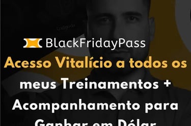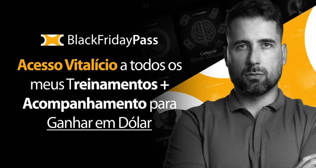 Em vez de comprar cada curso separadamente, o Black Friday Pass oferece um acesso completo a todo o ecossistema de treinamentos do Caio, com um único pagamento. É uma oportunidade de aprender com quem realmente vive o que ensina. Você vai fazer parte da comunidade que mais tem formado afiliados lucrando em dólar no Brasil.